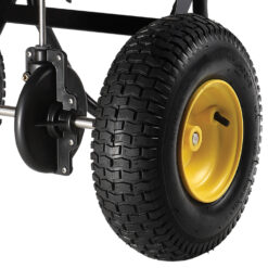 Large pneumatic wheels make it easy to push through yard, even uphill slopes.
